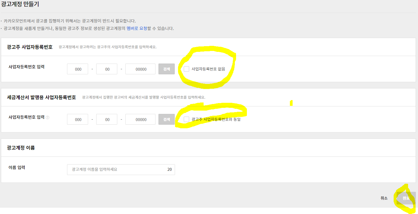 - 사업자등록번호가 없는 경우에 세금 계산서 발행이 필요하다면 대행사 사업자등록번호를 입력하여 사업자 광고주 계정으로 생성하면 되고