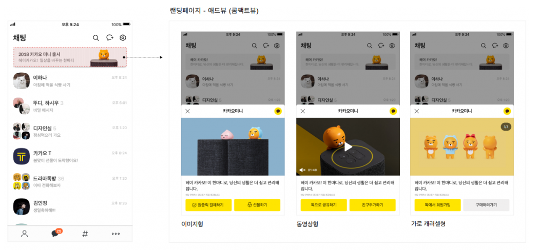 - 그래서 광고주 페이지뿐만 아니라 광고주가 원하는 다양한 카카오 플랫폼을 랜딩에 자유롭게 활용할 수 있다는 장점이 있다.