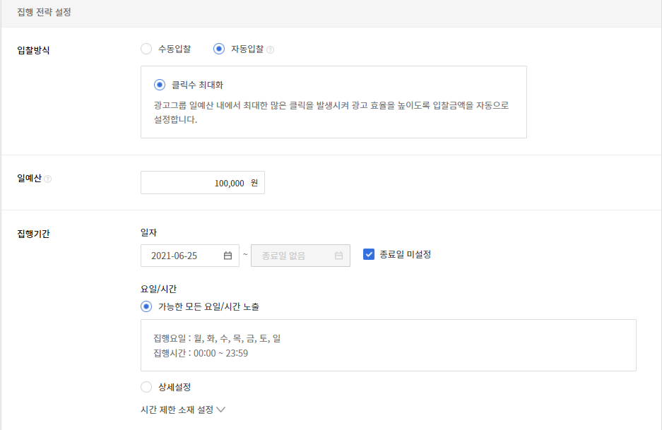 - 집행 전략 설정에서는 입찰 방식, 일예산, 캠페인 집행기간을 설정할 수 있다.