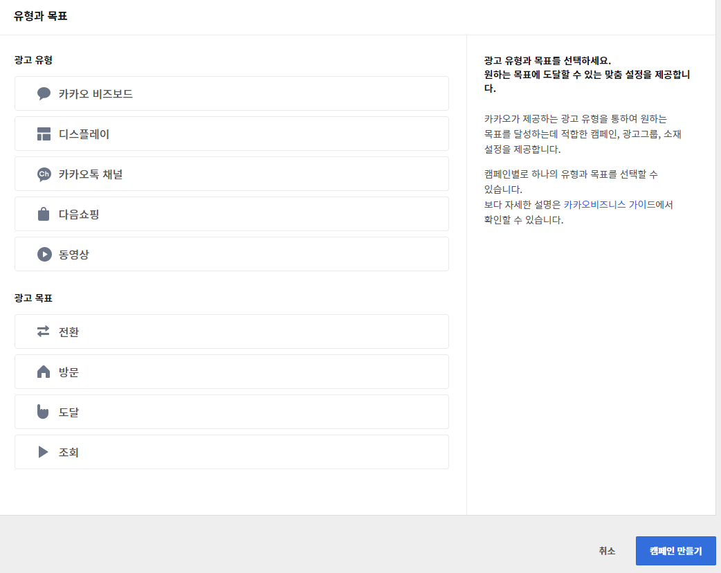 - 광고상품의 유형과 목표를 선택할 수 있는 화면을 볼 수 있다.