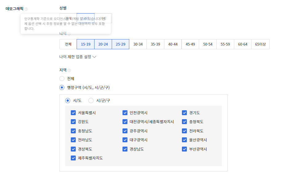 - 데모그래픽은 인구통계적인 특성으로 타겟팅을 설정하는 것으로 성별, 나이, 지역 등을 설정해주면 된다.
