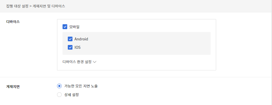 - 게재지면 및 디바이스 설정에서는 어떤 디바이스를 대상으로 할 것인지, 혹은 광고를 노출 시키고자 하는 게재지면을 선택할 수 있고,