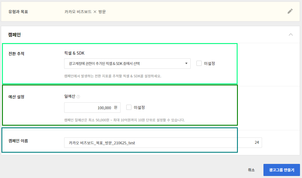 - 해당 화면에서는 전환 추적 설정, 일 예산 설정, 캠페인 이름을 설정할 수 있다.