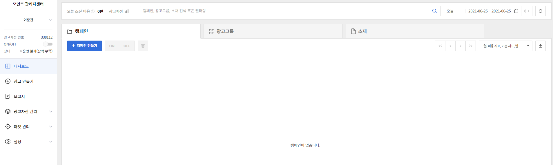 - 현재는 캠페인을 만들지 않은 상태이기 때문에 한 단계씩 실습해보면서 광고 캠페인을 새로 생성해보려고 한다.