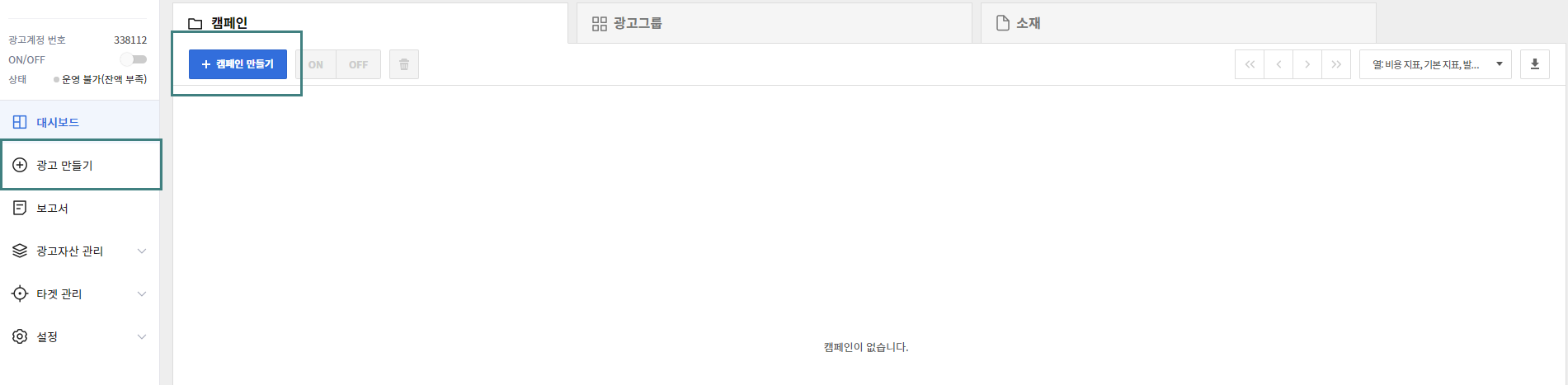 - 화면 좌측의 ‘광고 만들기’ 또는 ‘새 캠페인 만들기’를 누른다.