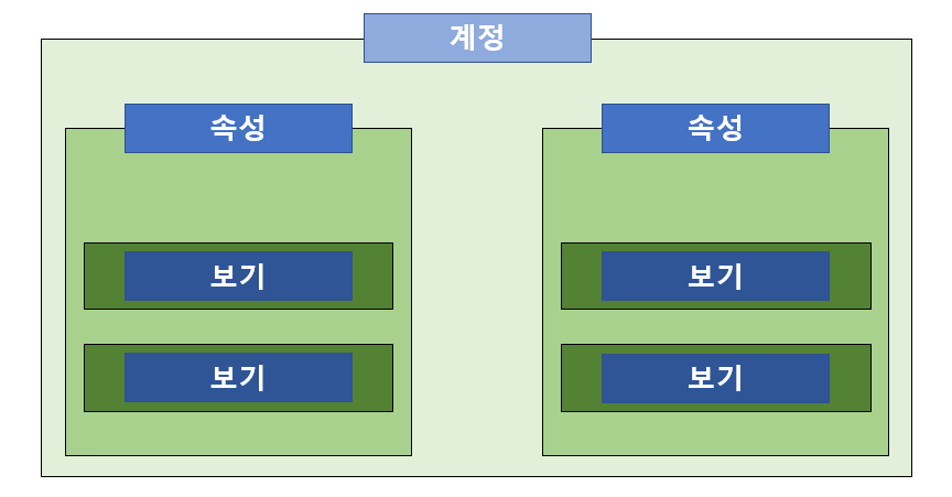 - 즉, 계정에 대한 접근 권한이 있는 경우 그 이하인 속성, 보기에 대한 접근 권한도 부여된다.