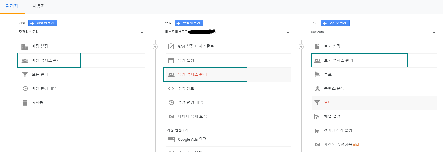 - 계정, 속성, 보기 각각에 대해 액세스를 관리할 수 있는 것을 확인할 수 있다.