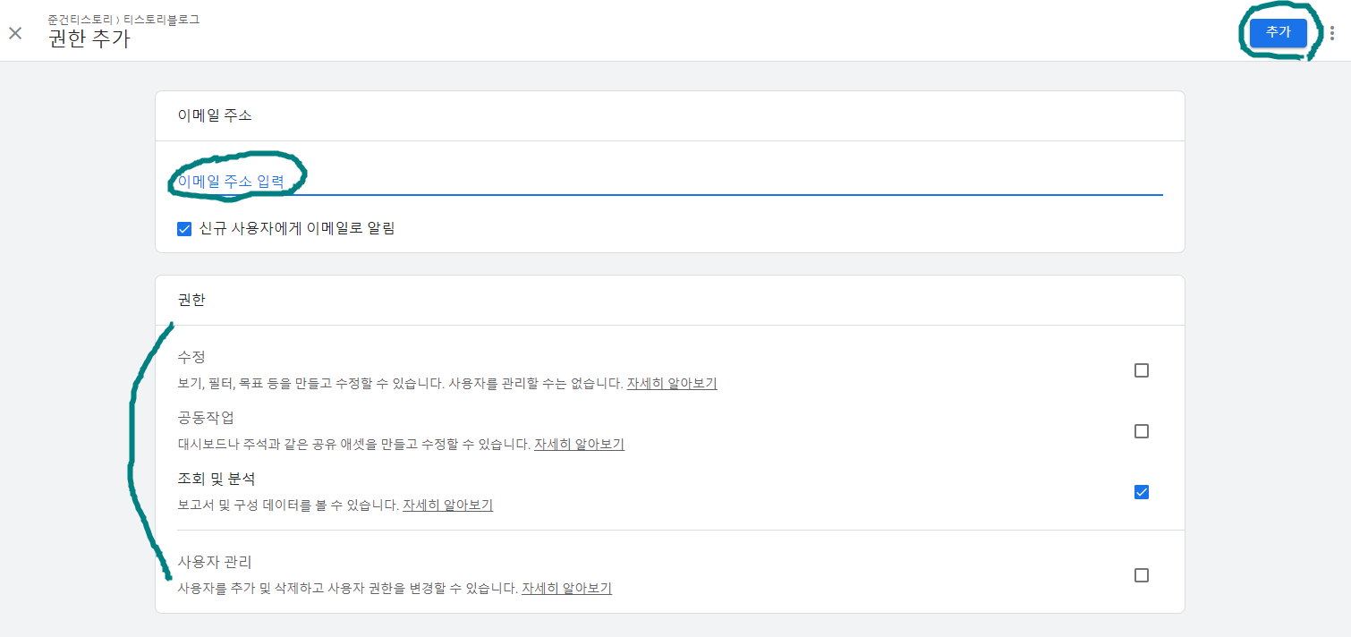 - 관리의 각 항목의 ‘사용자 관리’에서 구글 계정 이메일을 입력함으로써 이를 설정할 수 있다.