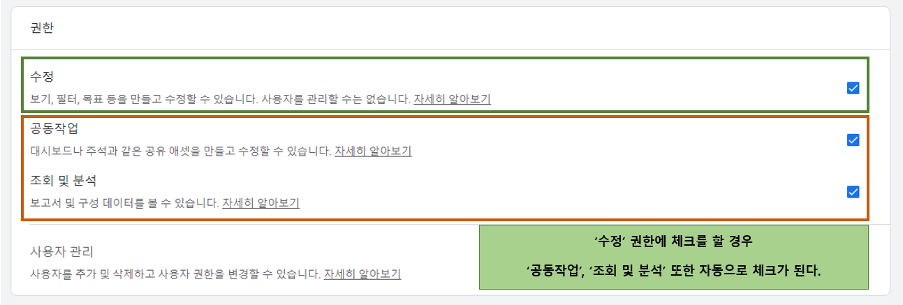 - 예를 들어 어떤 사용자가 계정 수준에서 조회 및 분석 권한을 가진 경우, 속성 수준이나 보기 수준에서 그 사용자에게 수정 권한을 추가로 부여할 수 있지만, 계정 수준에서 수정 권한을 가진 사용자에게 속성 수준의 권한을 조회 및 분석으로 제한할 수 없다.