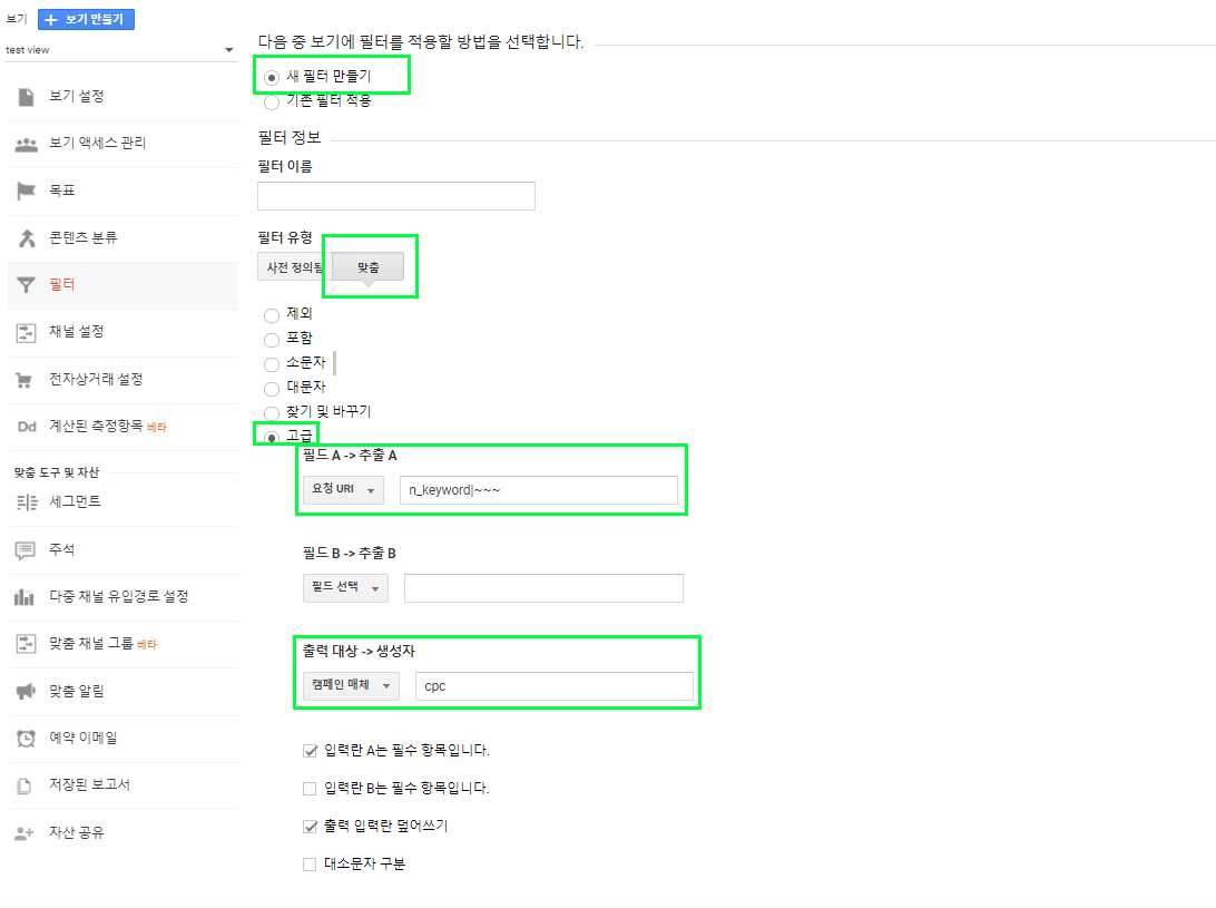 - ‘필드A- 추출A : 요청URI’ - ‘n_keyword|~~~’ - ‘출력대상-생성자 : 캠페인매체’ - ‘cpc’을 입력한다.