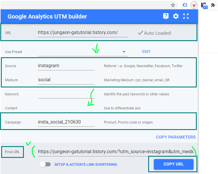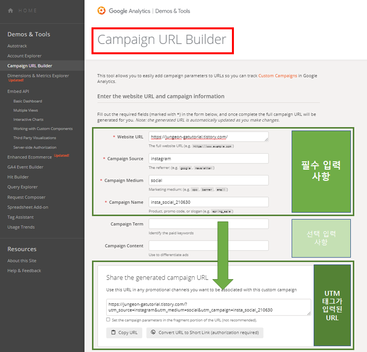 - Campaign URL Builder or URL 작성도구를 사용하면 쉽게 설정할 수 있다.