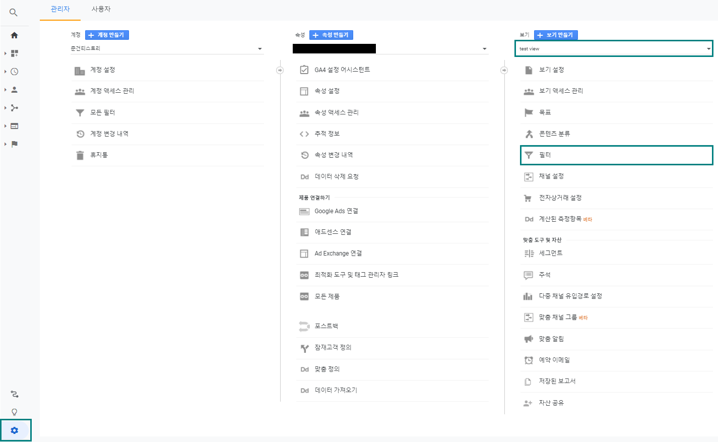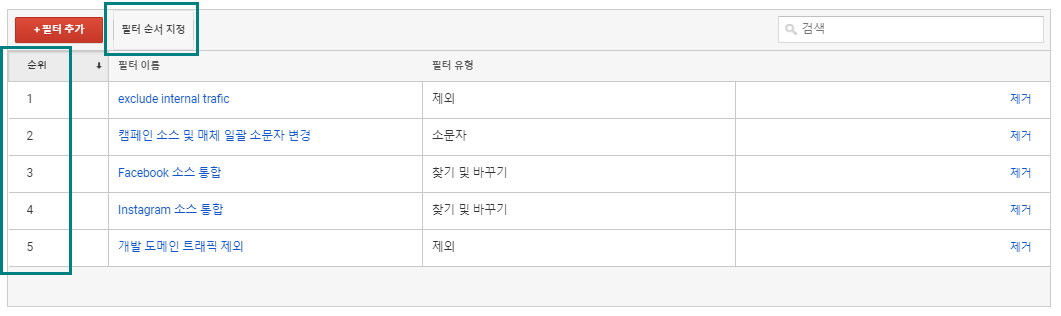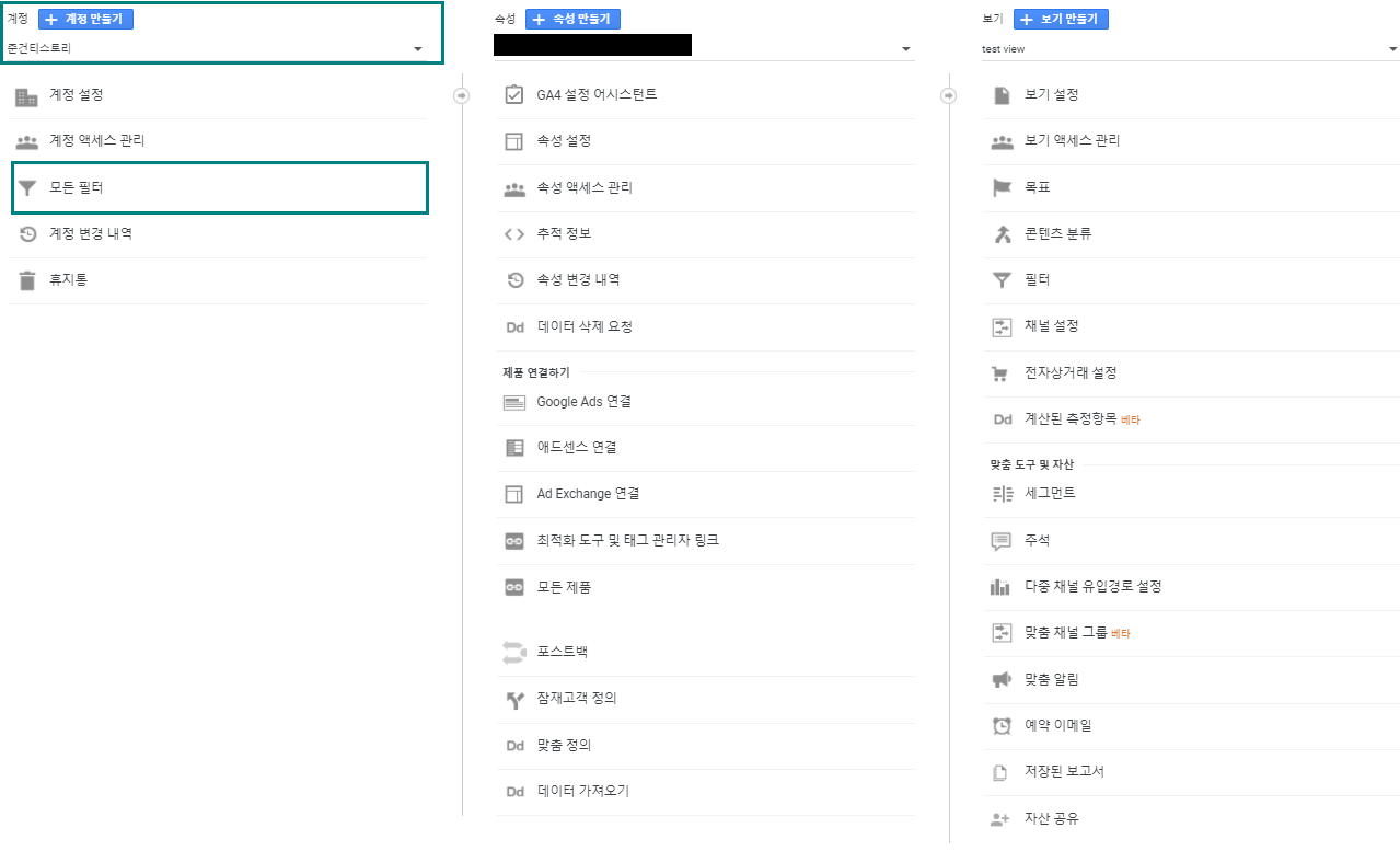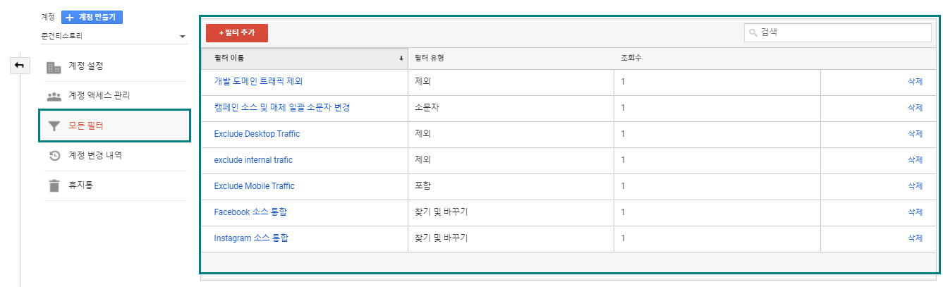 - 계정의 ‘모든 필터’에서는 생성된 모든 필터를 확인할 수 있고 각각의 보기에 추가 또는 삭제를 할 수 있다.