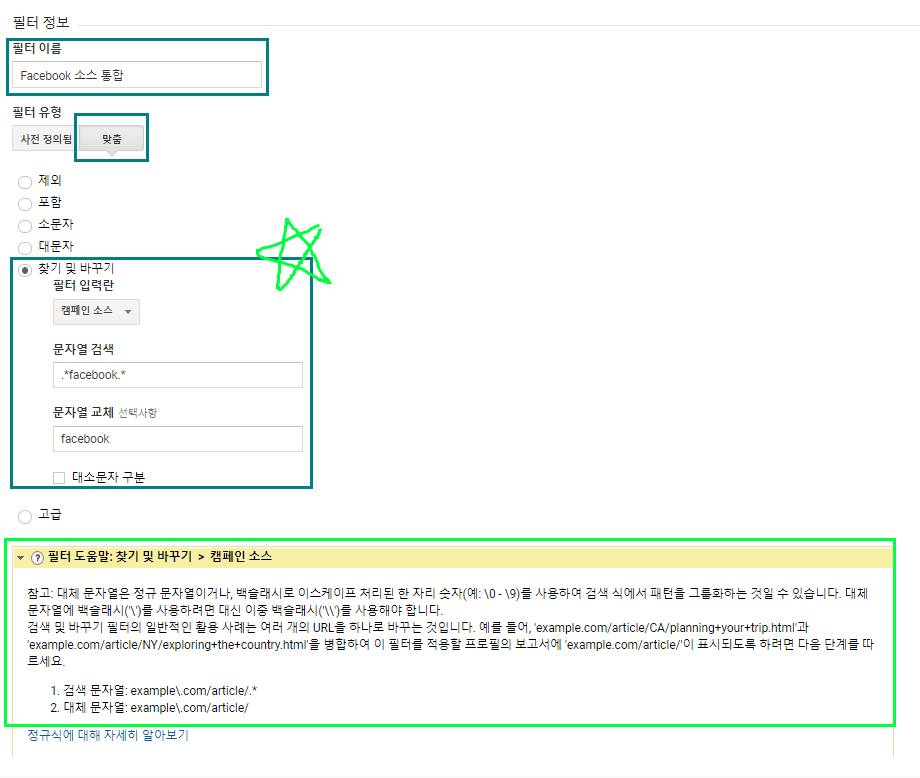 - 문자열 검색에 ‘.*facebook.*’을, 문자열 교체에 facebook을 입력하면 소스가 통합된다.