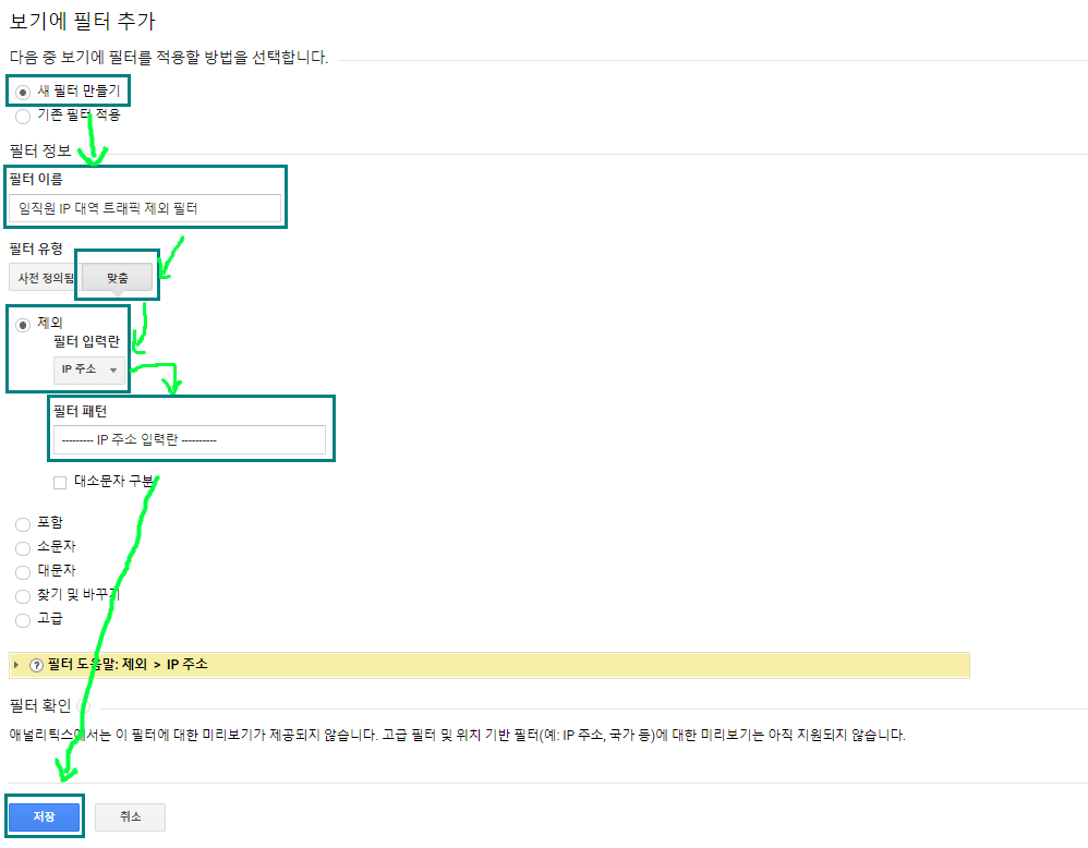 - 다음으로 필터 입력란(측정기준)에 IP주소를 선택하고 패턴에 임직원 IP대역을 입력하면 된다.