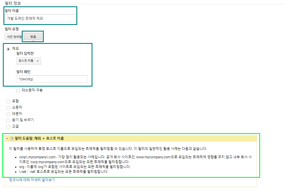 - ‘맞춤’에 ‘제외’를 누르고 ‘필터 입력란에 ’호스트 이름‘을 선택하고, ’필터 패턴에 ‘^(dev|stg)’를 입력한다.