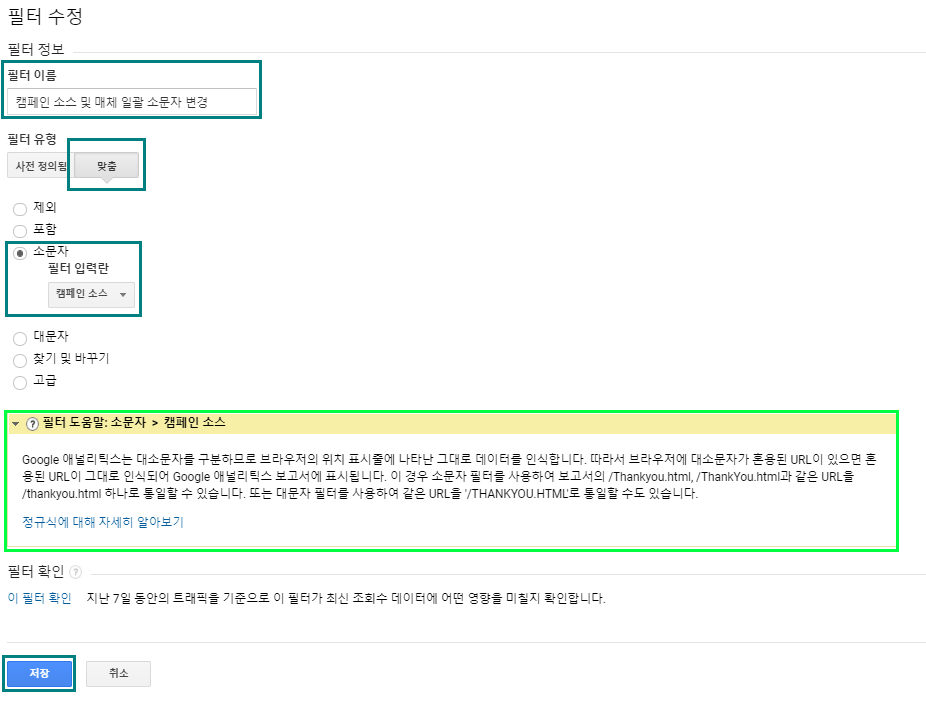 - 다음 필터 입력란에 ‘캠페인 소스’를 누르고 저장을 누르면 필터가 저장이 된 이후부터 모든 소스 및 매체는 소문자로 보여진다.