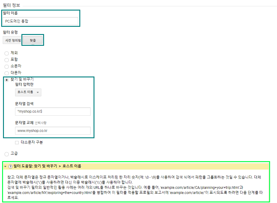 - 다음 ‘문자열 검색’에 ‘^myshop.co.kr$’를 입력하고 문자열 교체에 ‘www.myshop.co.kr’을 입력한다.