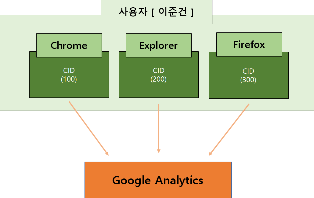 - 사용자가 같은 기기에서 접속을 하더라도, 다른 브라우저를 사용하는 경우 GA는 각각 다른 사용자로 인지를 한다.