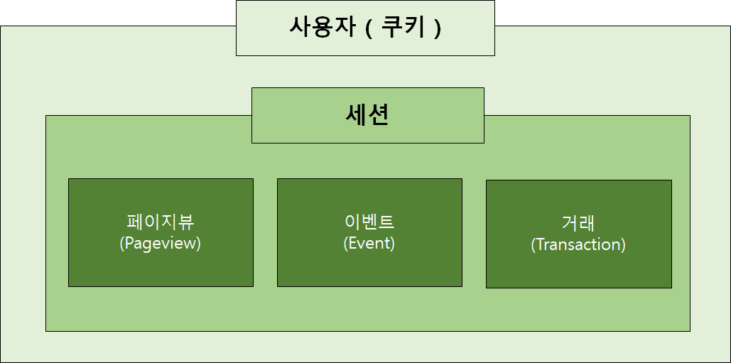 - 각 브라우저의 고유한 쿠키(사용자) 하에 세션이 있고, 세션 하에 페이지뷰, 이벤트 등이 존재한다.