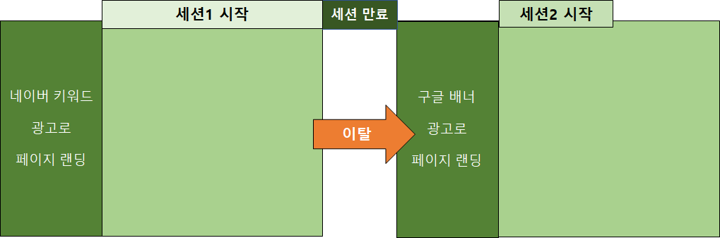 - 예를 들어 네이버 키워드 광고로 유입되었다가 이탈 후, 구글 광고로 다시 유입된 경우 소스 값이 달라져서 새로운 세션이 시작된다.