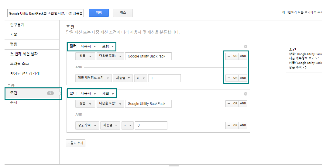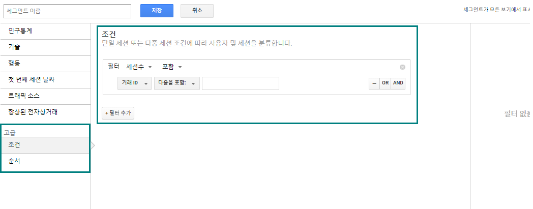 - 세그먼트 내에서 조건을 구성하는 필터를 여러 개 지정할 수도 있으며,