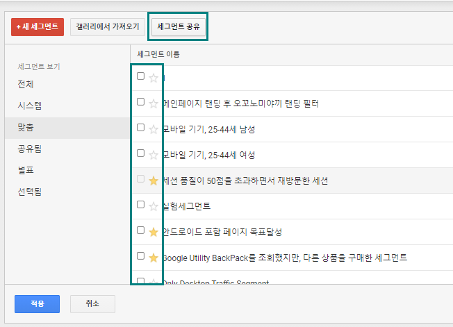 - 자주 사용할 것 같은 세그먼트는 즐겨찾기로 설정할 수 있으며, 이들 세그먼트는 선택된 것으로 표시된다.