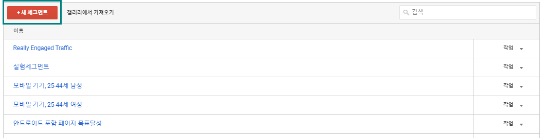 - 기본(또는 시스템) 세그먼트는 Google 애널리틱스에서 기본으로 제공되며 시스템 섹션(=기본 섹션)에 표시된다.