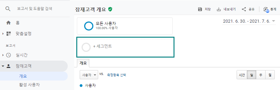 - 잠재고객 개요와 같은 기본 보고서에서는 '모든 사용자' 세그먼트가 자동 적용되고 선택한 기간에 해당하는 모든 사용자가 포함된다.
