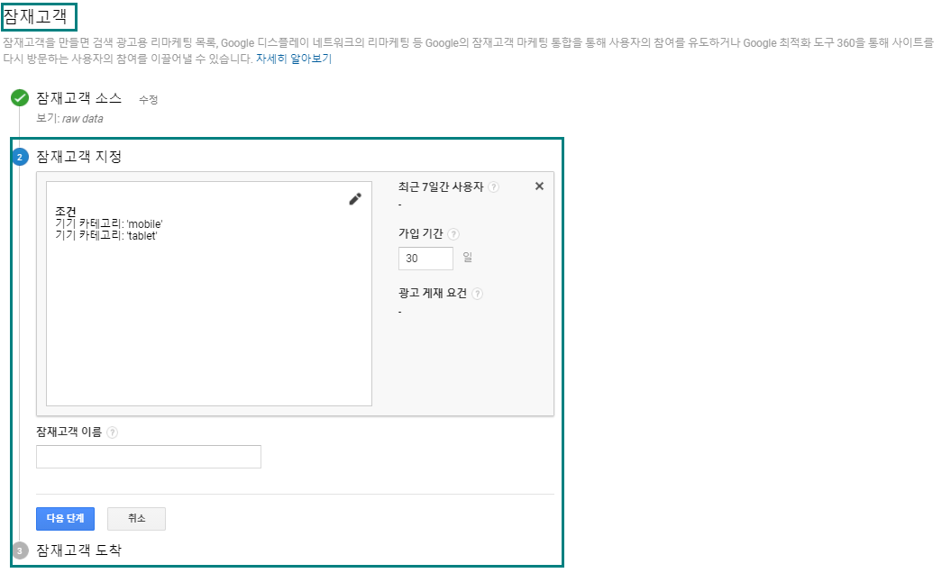 - '잠재고객 구축'을 선택하면 리마케팅에서 사용할 잠재고객을 만들 수 있다.