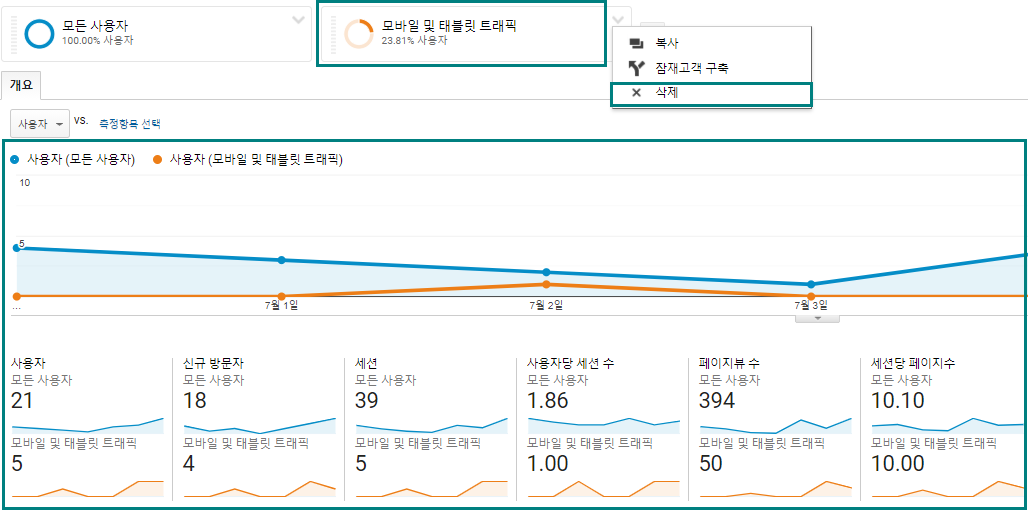 - 예를 들어 태블릿 트래픽을 선택하고 적용을 클릭하면 태블릿 트래픽과 보고서에 있는 모든 트래픽을 비교할 수 있다.