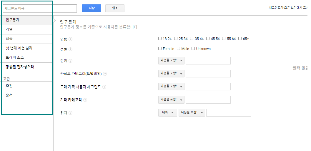 - 예를 들어 특정 연령, 기간, 성별, 또는 이들의 조합으로 이루어진 데이터만 표시되도록 사용자 세그먼트를 만들 수 있다.