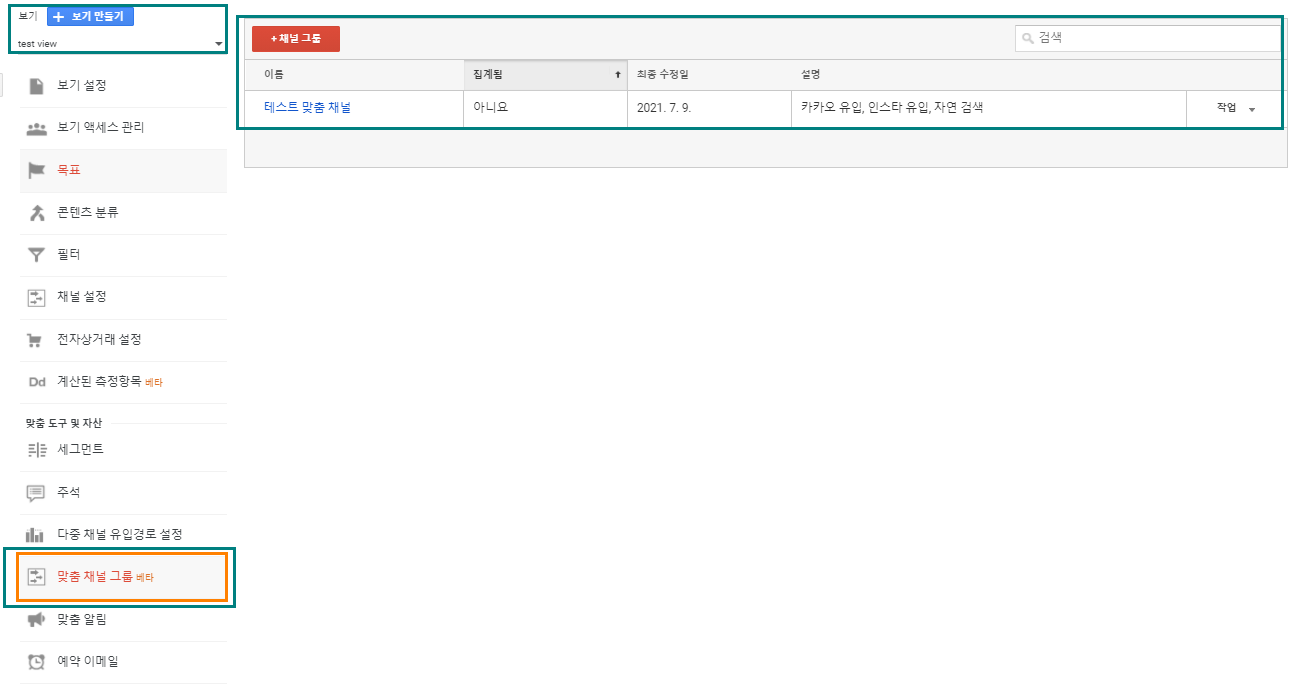 - 관리 섹션에서 맞춤 도구 및 자산에 있는 '맞춤 채널 그룹'을 활용하면 된다.