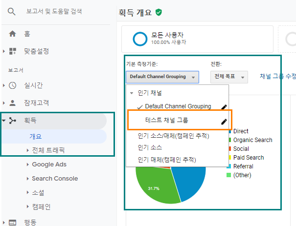 ■ 보기에서 새로 만든 채널 그룹은 기본 측정기준 드롭다운 메뉴를 선택한 후 채널 보고서에서 바로 확인할 수 있다.