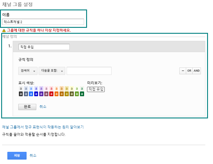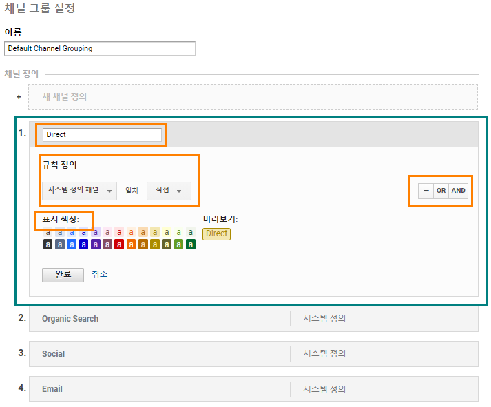 - 기본 채널 정의 이외에 다른 조건(‘or’, ‘and’)을 엮어 채널그룹을 설정하거나.