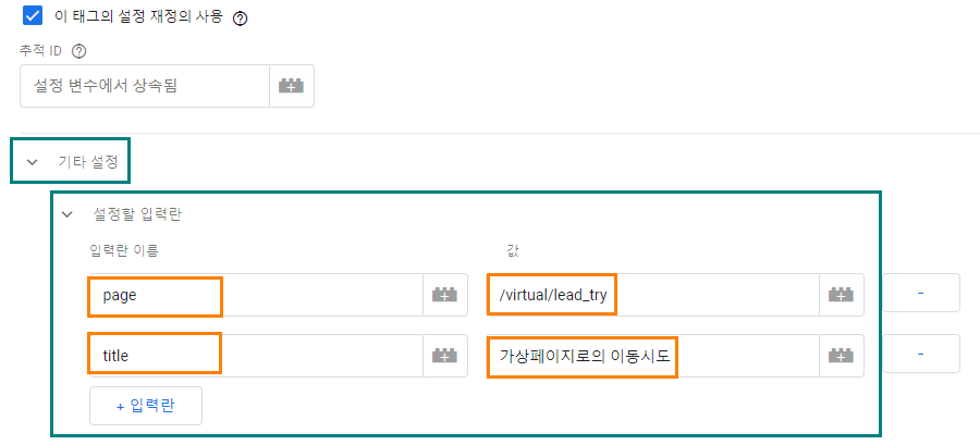 - ‘이 태그의 설정 재정의 사용’에 체크하고, 기타 설정 하의 설정한 입력란에