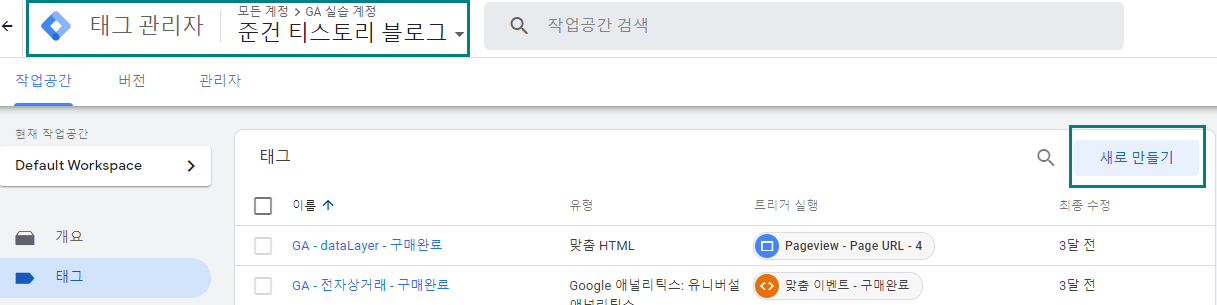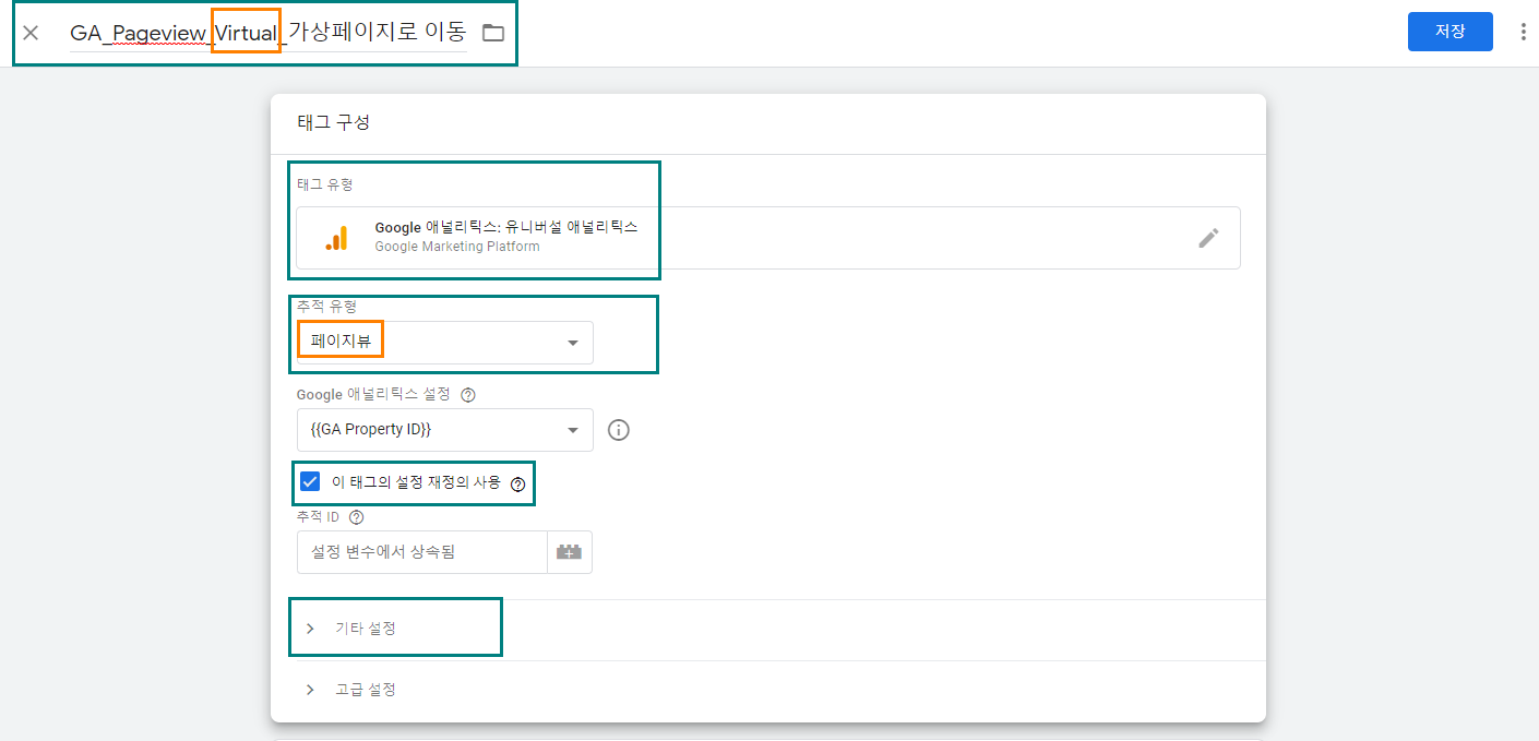 - GTM에서 새로운 태그를 생성한다. ex, GA-Pageview-Virtual-○○○○등으로 태그 이름을 설정한다.