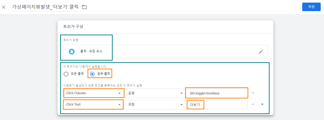 - ‘Click Text’ → ‘포함’ → ‘더보기’를 입력하고 저장을 누른다.