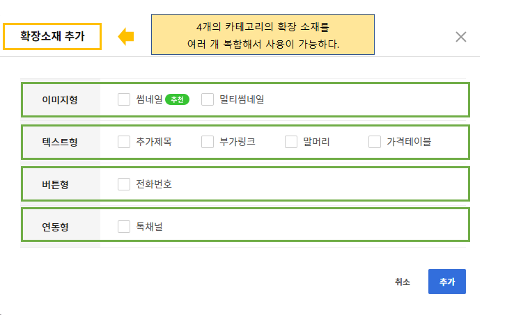 - 단순히 제목과 설명 문구 노출 외에 다양한 소재를 추가하여 더 넓은 광고 지면을 활용하여 전략적으로 노출 및 클릭률을 높일 수 있는 기능이다.