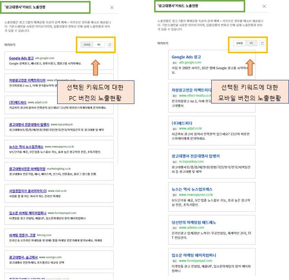 - 동시에 모바일 및 PC에서의 조회수, 최고입찰가, 평균경쟁광고수에 대한 정보를 얻을 수 있다.