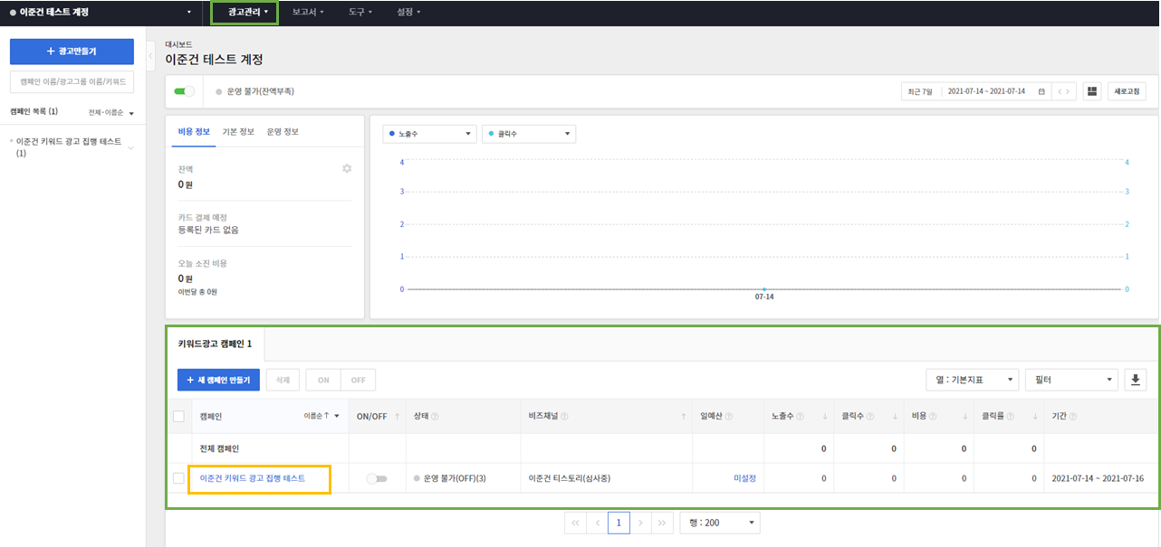 - '광고 관리' 탭의 '대시 보드'에서 생성된 광고 캠페인을 확인할 수 있다.