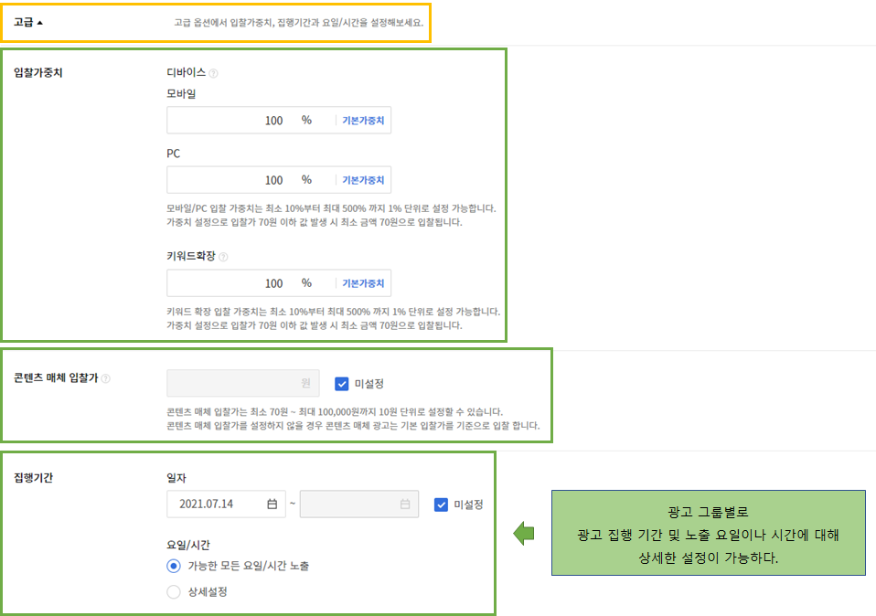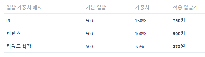 - 기본입찰가에 대한 가중치를 노출 디바이스별로 설정할 수 있다.