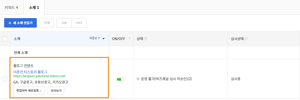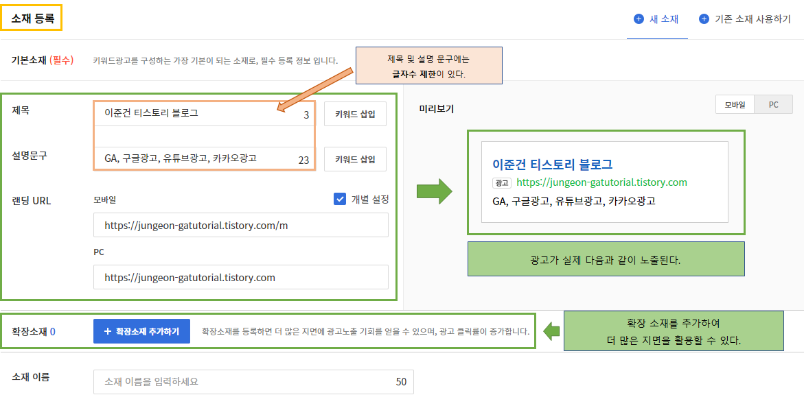 소재 만들기 단계에서는 등록한 키워드들이 검색이 되었을 때 광고를 어떠한 방식으로 보여줄 것인가를 결정하는 부분이다.