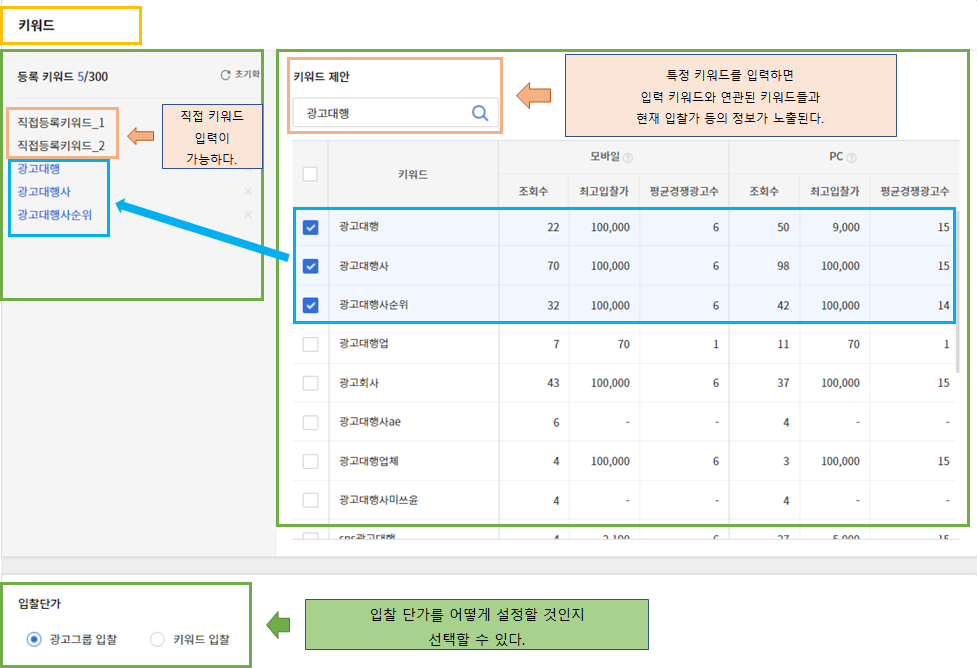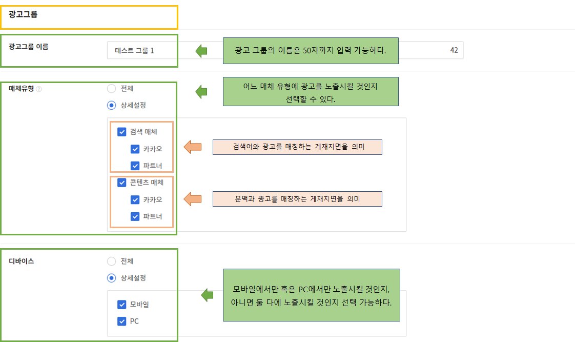 - 어느 매체의 어느 영역에 광고를 노출할 것인지, 어떤 방법으로 어떤 디바이스에 노출할 것인지, 키워드 확장 및 광고 집행 기간 등을 설정할 수 있다.