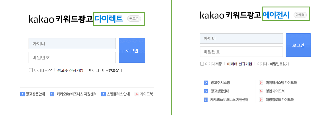 - 카카오 키워드 광고는 광고주가 가입할 수 있는 루트(다이렉트)와 마케터가 가입할 수 있는 루트(에이전시)가 나뉘어져있다.