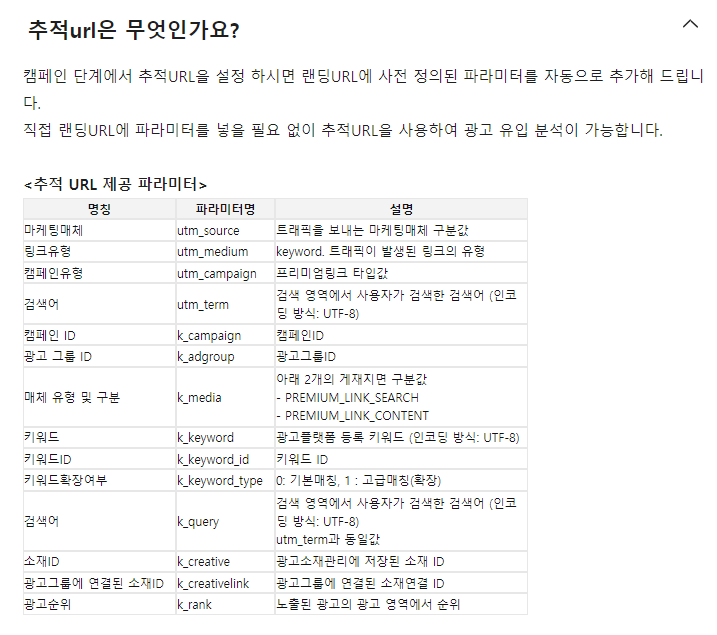 - 추적 URL : 광고 랜딩URL에 파라미터로 광고정보를 전달하는 기능을 설정할 수 있다.