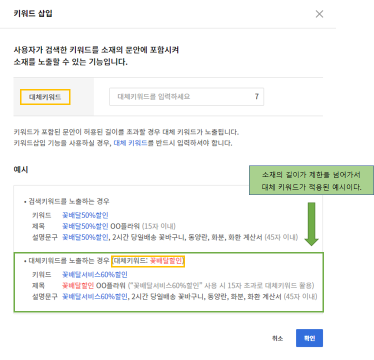 - 키워드와 소재 매칭 결과 키워드가 포함된 문안이 허용된 길이를 초과할 경우 대체 키워드가 노출되게 하는 기능이다.