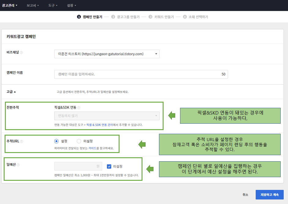 - 이 단계에서 비즈채널 선택, 캠페인의 이름, 고급 설정 등이 가능하다.